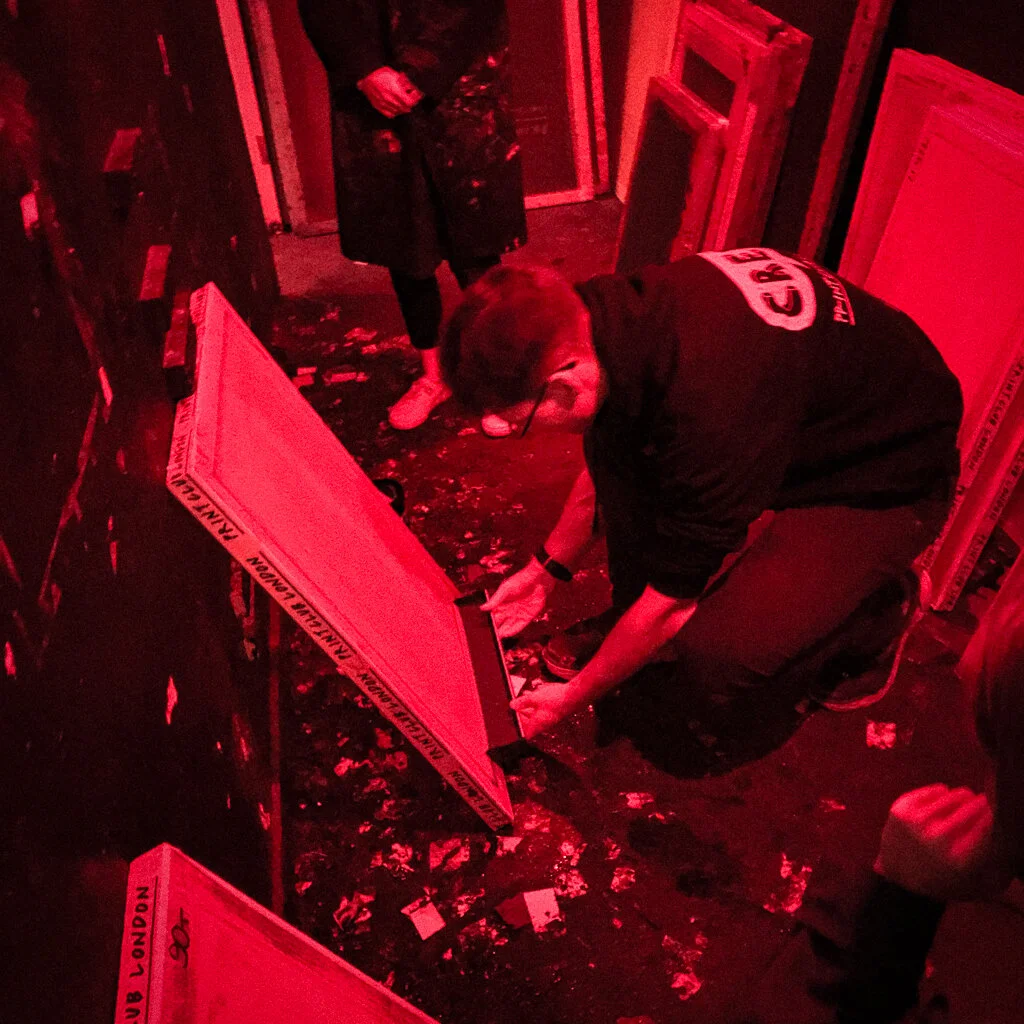 Once done, the artwork had to go through the UV bed again to harden the new emulsion. We also added brown tape to the edges of the screen frame, where the emulsion didn’t reach.